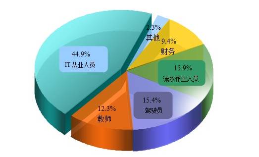 另外国内一项研究对患颈椎病高发职业进行了调查,调查结果表明:在颈椎病高发职业中,其中IT从业人员以44.1%的比例占据榜首,IT从业人员包括从事电子商务、文案工作以及美术平面设计等职业的人员,这些都是颈椎病的高发职业。其次流水作业人员以15.9%的比例仅次IT从业人员之后,另外驾驶员占了15.4%,教师占12.3%,财务人员占9.4%。