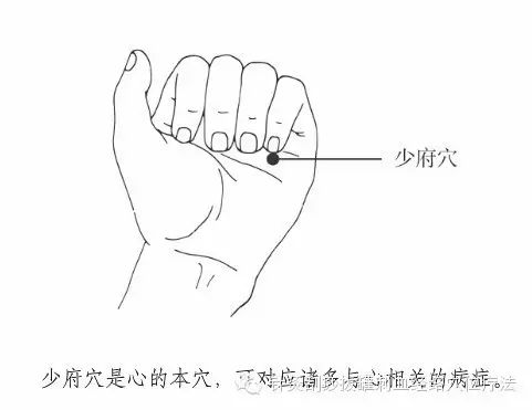 这是指少府穴,位置在手掌心,第4、5掌骨之间,握拳时小指与无名指指端之间。按压这个穴位不妨用些力,左右手交替。